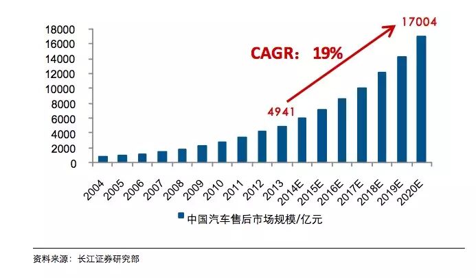 2015汽车维修保养市场规模达7000亿元,且市场处于快速增长期,按年复合增长19%计算,预计2020年将达到17000亿元的规模。